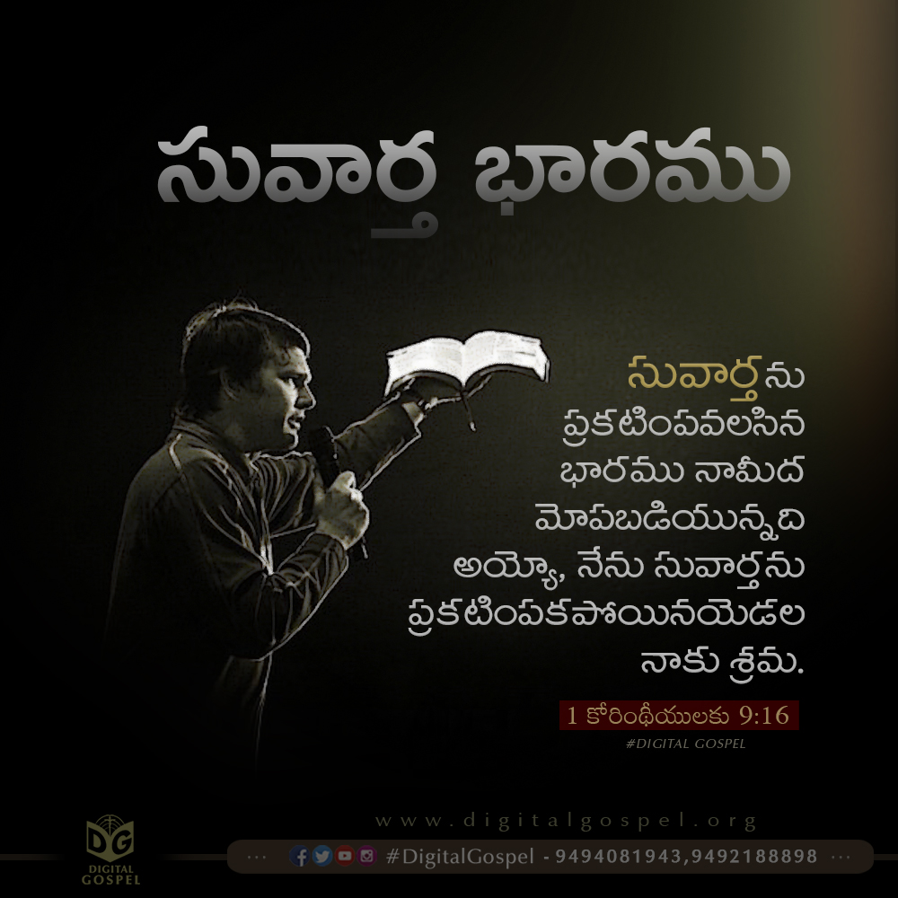 నేను సువార్తను ప్రకటించు చున్నను నాకు అతిశయకారణములేదు. సువార్తను ప్రకటింపవలసిన భారము నామీద మోపబడియున్నది. అయ్యో, నేను సువార్తను ప్రకటింపక పోయినయెడల నాకు శ్రమ. – 1 కొరింథీయులకు 9:16