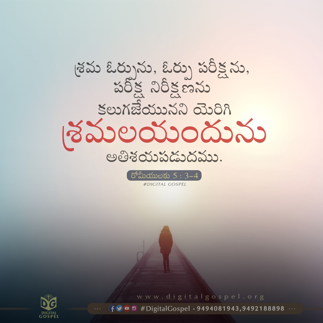 శ్రమ ఓర్పును, ఓర్పు పరీక్షను, పరీక్ష నిరీక్షణను కలుగజేయునని యెరిగి శ్రమలయందును అతిశయపడుదము. – రోమీయులకు 5:3-4