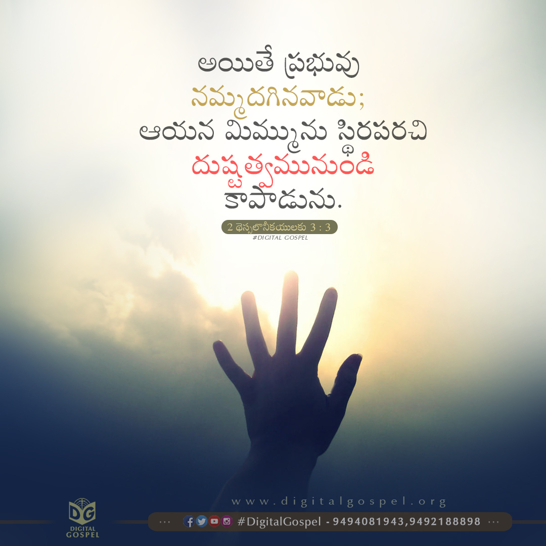 Views from 30-08-2021: 2,155 Download Now అయితే ప్రభువు నమ్మదగినవాడు; ఆయన మిమ్మును స్థిరపరచి దుష్టత్వమునుండి కాపాడును. – 1 థెస్సలొనీయులకు 3:3 But the Lord is faithful, who will establish you and guard you from the evil one. – 1 Thessalonians 3:3 Facebook WhatsApp Gmail Twitter Prev Post Proverbs 21:23 Next Post Habakkuk 3:18 Related Posts Psalms 59:16 Proverbs 8:33 2 Corinthians 6:1 Comments are closed.