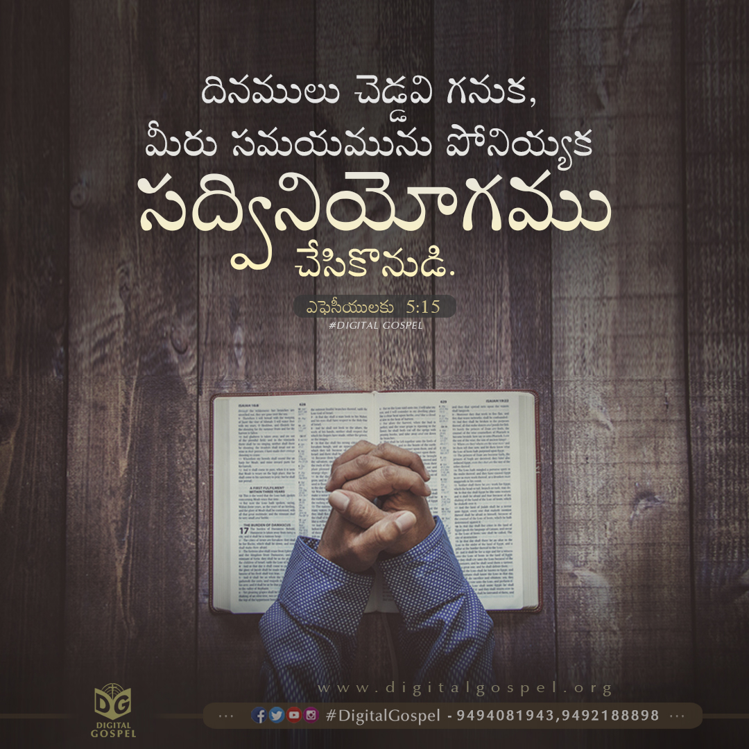 Views from 30-08-2021: 839 Download Now దినములు చెడ్డవి గనుక, మీరు సమయమును పోనియ్యక సద్వినియోగము చేసికొనుడి. – ఎఫెసీయులకు 5:15 See then that you walk circumspectly, not as fools but as wise. – Ephesians 5:15 Facebook WhatsApp Gmail Twitter Prev Post Proverbs 4:6 Next Post Papam bali korithae Audio Song || Telugu Christian Songs || Digital Gospel Related Posts Psalms 59:16 Proverbs 8:33 2 Corinthians 6:1 Comments are closed.