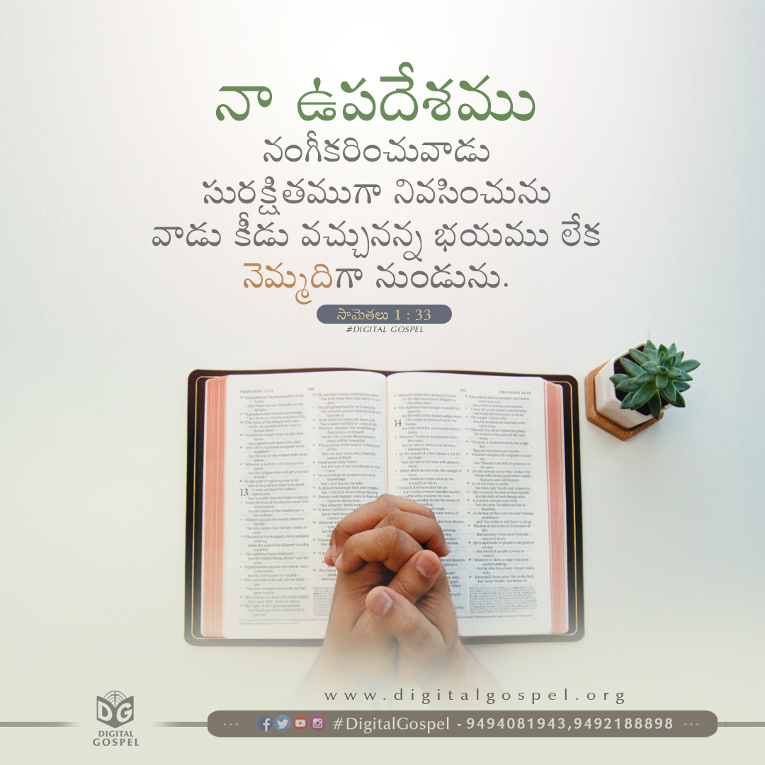 Views from 30-08-2021: 794 Download Now నా ఉపదేశము నంగీకరించువాడు సురక్షితముగా నివసించును వాడు కీడు వచ్చునన్న భయము లేక నెమ్మదిగా నుండును. – సామెతలు 1:33 But whoever listens to me will dwell safely, And will be secure, without fear of evil. – Proverbs 1:33 Facebook WhatsApp Gmail Twitter Prev Post Proverbs 22:4 Next Post Psalms 34:18 Related Posts Psalms 59:16 Proverbs 8:33 2 Corinthians 6:1 Comments are closed.