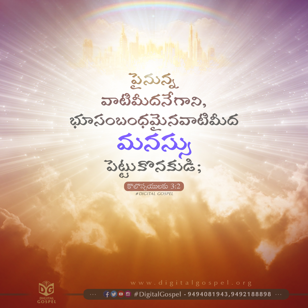 Views from 30-08-2021: 764 Download Now పైనున్న వాటిమీదనేగాని, భూసంబంధమైనవాటిమీద మనస్సు పెట్టుకొనకుడి. – కోలస్సయులకు 3:2 Set your mind on things above, not on things on the earth. – Colossians 3:2 Facebook WhatsApp Gmail Twitter Prev Post Proverbs 10:17 Next Post Romans 8:14 Related Posts Psalms 59:16 Proverbs 8:33 2 Corinthians 6:1 Comments are closed.